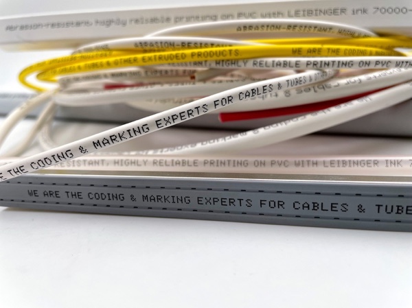 The marking of strands, cables, sheathed cables or even pipes, hoses and profiles made of soft PVC in a wear resistant manner presents a challenge to the cable and extrusion industry. An ink developed by printer specialist LEIBINGER is resistant to plasticizers and also prevents the transfer of printing ink to neighboring cables.