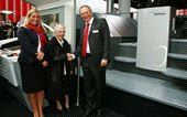 Sunday 01. June 2008 - On the opening day of drupa, Maria Manns (nee Stapperfenne) paid a visit to the Heidelberger Druckmaschinen AG (Heidelberg) booth, and Bernhard Schreier, CEO of Heidelberg, was on hand to welcome drupa's most senior visitor.