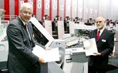 The new Diana X 115 was also awarded the ET and GS marks, making it the only folder gluer with these test certificates. The certificates and marks were presented by Albrecht H. Glöckle, Head of the Specialist Committee of the German Institution for Statutory Insurance and Prevention in the Printing and Paper Industry (Berufsgenossenschaft).