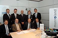 Finalising the contract at drupa for a 72-page LITHOMAN. Bottom row (from the left): Alwin Stadler, Regional Sales Manager Web Presses at manroland; John Caris, CEO of RSDB Holding; Jaap van de Vosse, General Manager of Senefelder Misset and Vice President Offset for the RSDB Group; Peter Kuisle, Executive Vice President Web Press Sales at manroland. Top row (from the left): Lodewijk Salomons, Sales Director of manroland Benelux; Maarten Coerman, Technical Management at Senefelder Misset; Gerard van Gessel, Technical Services Manager at Senefelder Misset; Werner Moriaux, Managing Director of manroland Benelux; Danilo Vaskovic, Web Press Project Manager at manroland.