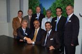 At drupa in Düsseldorf Al Arab/Dar Al Sharq and Muller Martini signed a contract for the installation of a high-performance ProLiner inserting system with integrated stitching unit: Shakehands between Fayek Shawky (center), Financial Controller Al Arab/Dar Al Sharq, Alois Hochstrasser (left), Director Müller Martini Marketing, and Mohammed Al Daheri, General Manager Giffin Graphics.