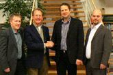 Goss International sales director, Peter Selby (center left), and Erik Ranängen (center right) Tryck i Norrbotten managing director, shake hands on the order with, Matti Lilja (left) and Peter Eriksson.