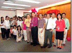 Lam Chuan Tan (center in red shirt) with Vietnam employees gathering at the reception area of the new office.
