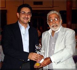 Tauqir Ahmed (left) receives the award from Hamid Maker, chairman of Helpline Trust.