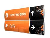 Vistas new ceiling suspended signs allow for the use of standard signage substrates such as: vinyl, paper and digital printing. The signs are very easy to update, the substrates are inserted into the sign frame by simply flexing and popping them in.