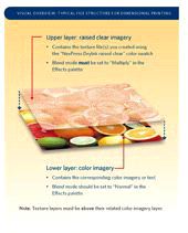The overall tactile effect is similar to relief printing, but with a greater degree of controlDimensional Printing can be set to produce variable heights, so a user can more closely mimic the texture of a specific image. And in contrast to thermography, which can only be applied to ink, NEXPRESS Dimensional Clear Dry Ink does not require ink or an image to adhere to the substrate.