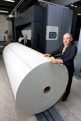 Pierluigi Guerini, director of Mazzucchelli (right) and the 2860 mm wide paper reel for the Goss Sunday 5000 press, with Francesco Rapisardi of Macchingraf, Goss Internationals commercial agent in Italy.