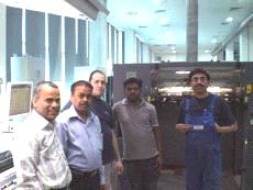 The team of Awal Press and Printing Instructor Antoine Mansour (third from left) and Electronics Engineer Gopal Raj (rightmost), both from the responsible manroland sales and service partner Dynagraph, are thrilled with the new ROLAND 700 HiPrint.