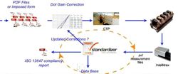 Accurate dot-gain correction curves are calculated and applied automatically either to the output files or exported directly to the plate setter. Alwan Print Standardizer also continually assesses the press calibration state and issues local and remote warnings when something is wrong in the printing process. For example, an ink problem, excessively high or low dot gain on a unit, imbalance in dot gain between units etc.