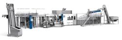 The ErgoBloc L consists of a Contiform S16 blow-moulding machine, BLOC-synchronised directly with a Multimodule labeller featuring two Contiroll stations for prelabelling the freshly blow-moulded containers. The labeller in its turn is BLOC-synchronised with a Volumetic VODM-PET filler, featuring an upstream base-cooling unit. The entire system has been designed for an output of 28,800 containers an hour, and can be used for both still and carbonated beverages. The goals laid down for the development work were to ensure, in comparison with a conventional line, a lower TCO (Total Cost of Ownership) for the clients, a high level of efficiency combined with an optimised material flow, an improved operator control concept, and a downsized footprint. The ErgoBloc L concentrates exclusively on value-creative functions, saves energy, and is also ideally suited for handling lightweight containers.
