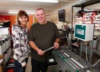 Angela and David Risley at Rapid Print, Sudbury, with the new finishing equipment from Rollem.