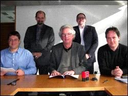 The signing ceremony between Offsetdruckerei Schwarzach and Manroland Austria. Sitting from left to right: Mr. Johannes Knapp, Technical manager of Offsetdruckerei, Mr. Ewald Fischer, General Manger of Offsetdrucekrei and Mr. Ralph Joser, Finanzial Manager of Offsetdruckerei.Standing in behind from left to right: Mr. Alexander Elbs, General Manager manroland Österreich and Mr. Thomas Blechigner, Key Account Sales Manager manroland Österreich.