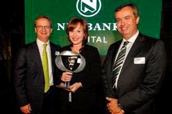 Left to Right: Mike Brown (Nedbank Group chief executive), Lora Rossler (Mondi Group: Head of Corporate Affairs) receiving the award on behalf of Mondi, and Brian Kennedy (Group Managing executive, Nedbank Capital).