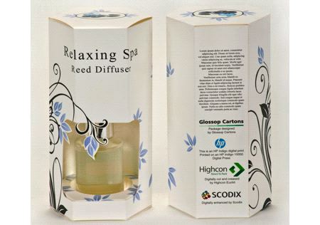 This Spa Diffuser package was designed by Glossop Cartons, digitally printed on an HP Indigo 10000 digital press, digitally enhanced by Scodix and digitally cut and creased on the Highcon Euclid