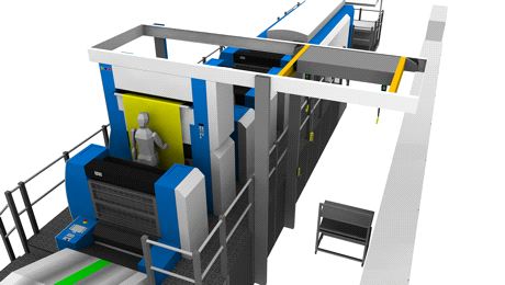 Rapida presses with the ColdFoil Micro SF110 GF module are fitted with a crane for handling of the full and empty reels. This allows reel replacement without physical effort. The remote control unit for opening and closing of the shaft locks also renders an additional walkway superfluous. Accessibility to the inking units is not restricted in any way.