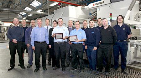 BOBST this week presented the plant with two commemorative plaques to record the achievements. A Platinum Box award recognised the achievement of the ‘B’ shift, while a Double Diamond Box award was presented to the plant in recognition of ‘A’ shift being the current world record holders for BOBST FFG 618 Quatro production. The BOBST FFG 618 Quatro is the benchmark mini-line casemaker for retail ready packaging manufacture, offering high running speeds, quick set-ups and fast changeovers. The line at Desborough has been fitted with a BOBST FFG PALLETIZER which further enhances the productivity of the FFG 618.