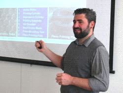 Roger Oberholzer, responsible for Print & Workflow Support at Gallus, explains to interested participants how the degree of hardness of the adhesive mounting tape affects the print result in flexographic printing.