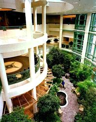 When an entirely new hospital was built the designers took all of this feedback into consideration. The main building was built around a four-story atrium with a glass ceiling. The cafeteria on the ground floor received natural light all day and many of the offices faced the atrium to take advantage of the light. Unified hospital wayfinding solutions were implemented to create a seamless experience for staff, patients and visitors. Joe Novara, former Media Center Supervisor for the hospital, also created original art for the walls.