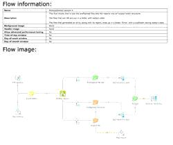 With one click, users can easily generate an HTML page which includes all information about their flow, including flow name, description, and creation date; the flow image as shown on the canvas; and the properties of all elements in the flow.