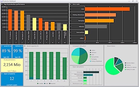 The C3 business intelligence dashboards bring together all of the important figures and information in a management cockpit. The key elements of a BI dashboard are the adjustable user interface and the ability to combine real-time data from various areas. With just one click on a dashboard, different interest groups, such as sales, production, or controlling, receive the information that is relevant to them and always up to date. One example for the use of a dashboard is a production cockpit that shows production output, on-time performance, costs of errors, and capacity at a glance, with all of this information always up to date. The dashboard visualizes the key results in clear and well-organized graphic form, making it easy to monitor.