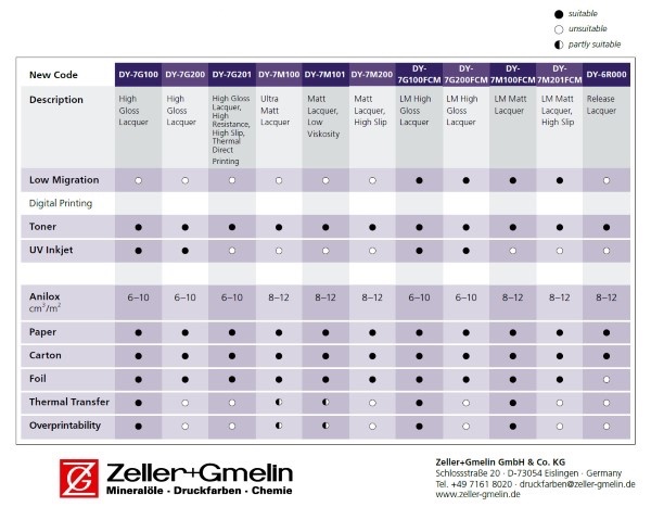 The printing ink manufacturer Zeller+Gmelin GmbH & Co. KG has developed a product range of varnishes under the name of Uvaflex.digital, which is specifically designed for varnishing digital prints in the UV-flexographic printing process. It includes a range of gloss and matt varnishes, which are also available in low-migration versions. Depending on the individual application, a correspondingly adapted type of varnish is recommended. In an overview, the company which is based in Eislingen and specializing in the radiation curing segment, provides information on whether a type of varnish is suitable for toner-based processes and / or for UV-inkjet. Moreover, it is specified which substrates can be processed with the respective varnish and which cell volume of the anilox roller is recommended for the purpose in question.