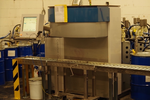 ACW-Films Colorsat Compact includes a unique, IECEx1-certified explosion-proof safety feature. A grounding wire is clamped to the Compacts ink barrels that hold base components and are in turn connected to the dispense head. The wire is also fixed to the ground, thereby conducting static electricity and preventing sparking that can lead to explosions. An alarm light alerts operators if the ground wire is not properly connected to the ink barrel.