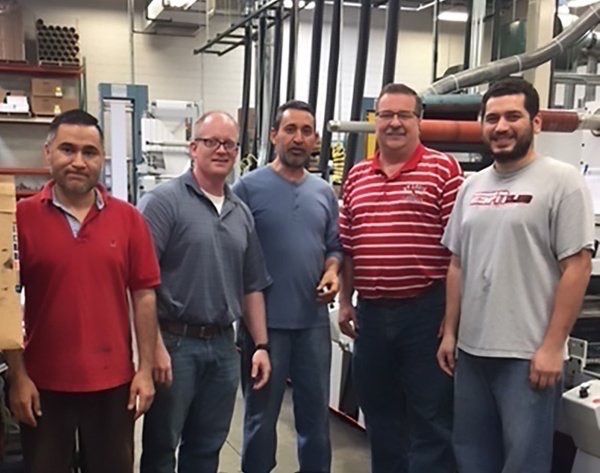 (from left to right) Jaime Camargo, Ross Mussano, Ruben Ramirez, Ron Kassal, & Ruben Alvarez with the new P5 press in Continental Datalabel’s Illinois facility.