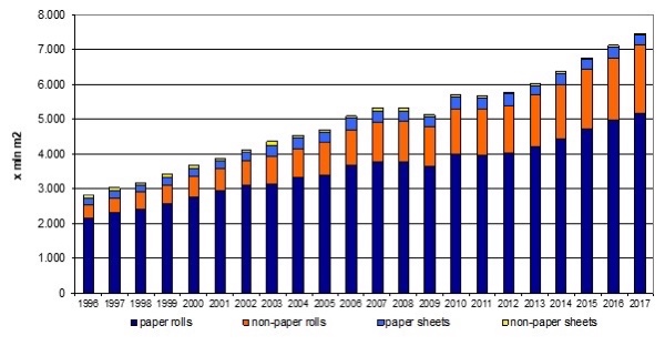 These findings are based on the backdrop of a 4.7% European growth rate in total consumption of self-adhesive label materials, up to 7.45 million m2 in 2017, slightly below the 5.4% average over the preceding four years.