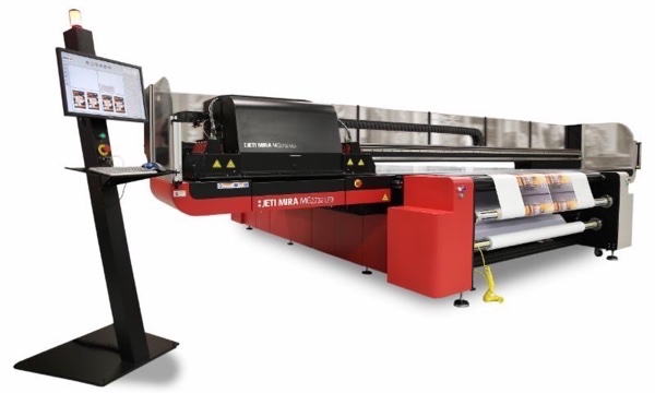 – Jeti Mira MG2732 HS LED with varnish and RTR – This powerful moving-gantry flatbed printer is designed for optimal flexibility. Jeti Mira’s ‘Print & Prepare’ function enables the operator to load one side of the table while the other side is printing for non-stop productivity. The Jeti Mira reaches speeds up to 2,669 ft²/hr (248 m²/hr) and produces industry-leading print quality in six colors (CMYKLcLm) and white, with optional (3D) varnish or primer.