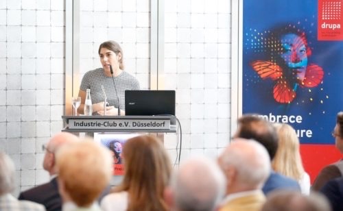 The drupa Prize, accompanied by prize money of Euro 6,000, is endowed and presented annually by Messe Düsseldorf to honour exceptional achievements in the humanities at the Faculty of Philosophy of Heinrich Heine University in Düsseldorf. This years drupa Prize was presented on 17 June 2019 in the presence of invited guests at Düsseldorf Industrie-Club by Rainer Hundsdörfer (Member of the Exhibitors and Visitors Advisory Board of drupa and CEO of Heidelberger Druckmaschinen AG), Hans Werner Reinhard (Managing Director of Messe Düsseldorf GmbH), Prof. Dr. Anja Steinbeck (Rector of Heinrich Heine University Düsseldorf), Prof. Dr. Achim Landwehr, Dean of the Faculty of Philosophy at Heinrich Heine University Düsseldorf and Prof. Dr. Ingo Plag from the Institute of English Studies at the Faculty of Philosophy at Heinrich Heine University Düsseldorf.
