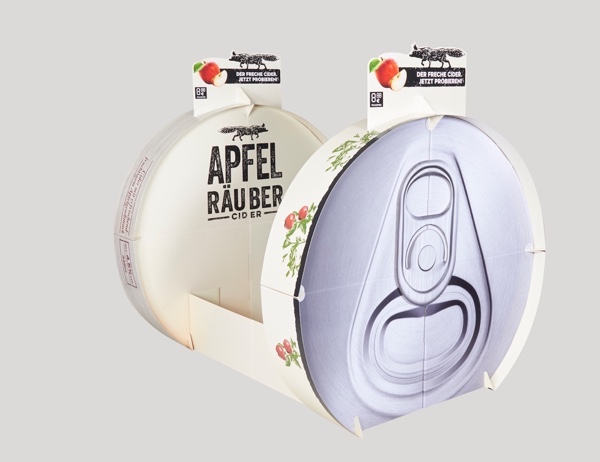 In order to communicate the product characteristics optimally at the P.O.S., the manufacturer presents the apple robber in a second placement by Panther Display, which takes up an oversized beverage can in the design. The practical can is thus unmistakably set in scene and the attributes of the brand unmistakably presented visually. Inside the display there is space for one Euro pallet or four ¼ pallets. The large-capacity can thus offers a very large volume for product storage.