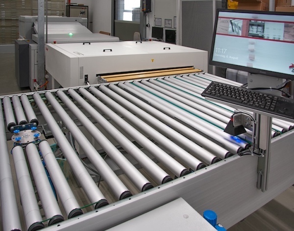 The MAGNUS Q800 Platesetter with the APL and the plate processor were installed in a separate, air conditioned room adjacent to the pressroom and hooked up to an automatic plate conveyor and sorting system from Nela. To enable faster processing, imaged plates enter the processor in landscape orientation and are deposited on a table belonging to the Nela system, where a QR code with stored job data is machine-read in preparation for automatic sorting of the plates according to job and color. The plates are then transferred through an opening in the wall into the pressroom, sorted and stacked on trolleys before traveling the short distance to the presses. The system has four docking stations, so that four of Zarbocks twelve plate trolleys can be loaded with new plates at a time. A large monitor in the pressroom and a printed list for each trolley show the printers at a glance which plates are loaded where.