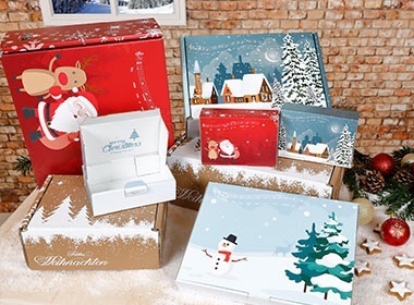 The customisable Christmas packaging is available as a postage-optimised Maxibrief in various sizes and also as a secure package. “The shipping packaging is fitted with secureLock, a tamper-proof lock made from corrugated cardboard. Thanks to this locking technology of the shipping box, no additional adhesive tape is required to close it. The lid is firmly attached to the packaging and can no longer be opened without destroying it,” says Michael Weber explaining the security role of the packaging. The Christmas designs have been applied using digital printing processes which make it possible to implement such customisable packaging for very small print runs or as a one-off order.