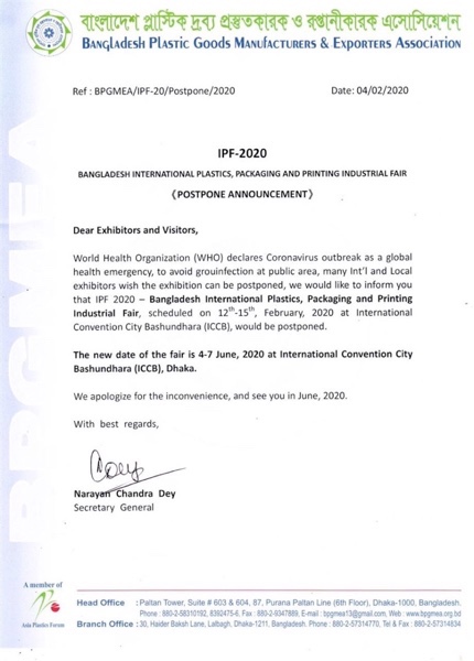 Furthermore, we have decided to re-schedule IPF 2020 from 12th – 15th February to 4th -7th, June at the same venue ICCB in Bangladesh.