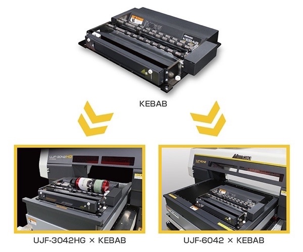 Actually, there are different models of the Kebab option available. The original Kebab model is compatible with Mimaki’s flatbed UV printers UJF-3042HG and UJF-6042. The most recent models, namely the Kebab MkII and the Kebab MkIIL – which differs in size – are designed to be used in combination with the UJF-3042MkII and UJF-3042MkII EX, and with the UJF-6042MkII, UJF-7151 plus respectively.