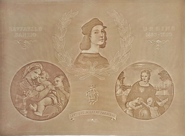 Cartiere Miliani Fabriano celebrated Raffaello Sanzio in the past on numerous occasions producing watermarks with his effigies, paper and drawing albums bearing his name. Amongst the 10,000 tools preserved by Fondazione Fedrigoni Fabriano in the Historic Paper Heritage Warehouse there is a variety dedicated to Raffaello (punches, silicones, plates, moulds, wire-cloths for cylinder mould machine and dandy rolls), in particular 15 moulds used in the manufacturing of handmade paper which portray Raffaello and some of his most famous works. Amongst these, a gigantic mould measuring 85×115 cm which was handled by three men simultaneously by means of the ancient technique using a girella (type of pulley tied to a mould by means of a cable), produced in 1983 on occasion of the 500th anniversary of the birth of the artist. A piece of inestimable worth. Furthermore, from about 1947 to 1976 Cartiere Miliani produced a drawing paper album “Raffaello” (today known as “Fabriano 2”) at Pioraco with the Fourdrinier machine.