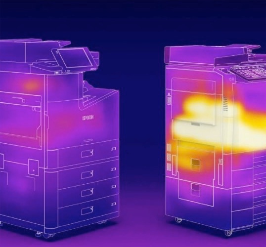 An Epson survey makes it clear that for both customers and employees, sustainability strongly influences the value of a brand (Bild: Thermal image of a laser printer [right] compared to an inkjet printer [left]).
