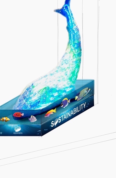 The word “S.O.S.TAINABILITY”, created from the graphic combination of “sustainability” and the Guandong logo, will be the protagonist of a large, eye-catching backlight made of the special Texon backlit textile. An entire wall will be dedicated to the new trend of wall decoration, with interchangeable graphics made of TAP, a self-adhesive polyester textile, the magnets and ferrites of the M&F Visual Comm line, and with ReVita Tack, a recyclable polyester made from the reuse of PET bottles, available in Classic and Puro versions with Nanodots adhesive technology. The reception area features a dynamic light box with evocative light shows made of backlit Lumi textile decorated with the GreenLife typeface, the brand that has marked Guandong’s commitment to sustainability since 2010. The large crossword puzzle printed on rewritable magnetic material will also be in line with this theme, so visitors can try to find “green” words. In the centre of the stand, a large whale made from recycled plastic bottles swims in a real sea, depicted with water effect prints on High Clarity, Guandong’s special optically transparent self-adhesive vinyl. Next to it, repositionable fish and sea creatures with double-sided printing on Wally and Nanotack with Nanodots.