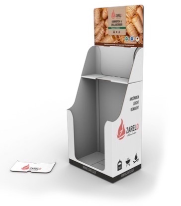 The eco display for Zarelo unites sales-promoting aesthetics with an environmentally friendly design – with its high-quality flexo printing and a top sign that reflects the content below, it is a guaranteed eye- catcher at the point of sale. Its special design opens up a second level as a presentation surface to facilitate sales. Not just the display itself, but also the affixed pallet feet are made of 100% recyclable corrugated cardboard. A ready-made transport system with a pallet guide made of corrugated cardboard at the top and bottom also replaces the usual plastic straps or shrink film, ensuring maximum environmental friendliness all the way from production to transport and use at the point of sale. After all of the articles have been sold, the complete display can simply be disposed of as waste paper.