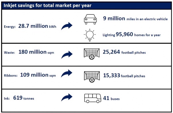The disposal of the ribbon is not often considered as part of brands overall sustainability footprint. However, if all current thermal transfer printing for labels were to switch to inkjet the savings could be significant. If businesses made the switch to inkjet on-demand label printing savings of 109 million square metres of ribbons (15,333 football pitches) and 619 tonnes of ink (41 buses) could be achieved.