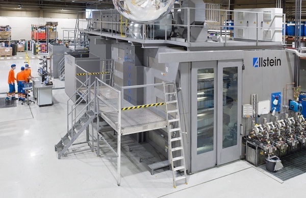 The printing machine is also suitable for heat-sealable solutions for non-food items and e-commerce packages. The printing width of the Allstein press is 1600 millimetres, which is sufficient for large packages, like corrugated cardboard packaging.