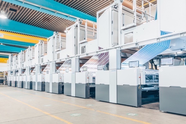 The printing speed is up to 600 meters per minute, which corresponds to around 38,000 print sheets in format 6 (sheet width 148 centimeters) per hour.
