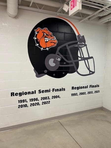 The school requested graphics featuring a giant version of one of its football helmets, as well as wording showing which years the school had competed in the regional semi-finals and regional finals.