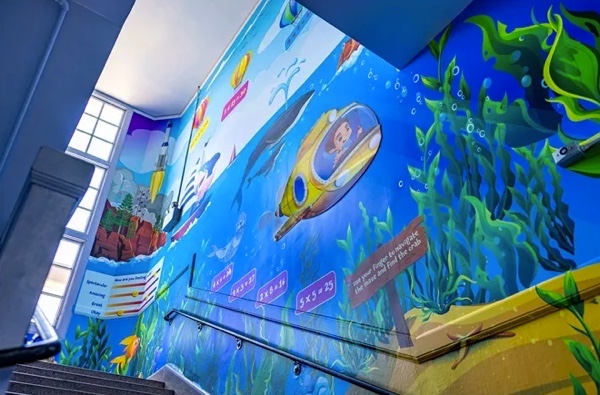 ●Math and language memorization: Extending learning outside traditional settings, the design merges math and foreign language components onto hallway surfaces, fine-tuning math problems according to specific age categories.