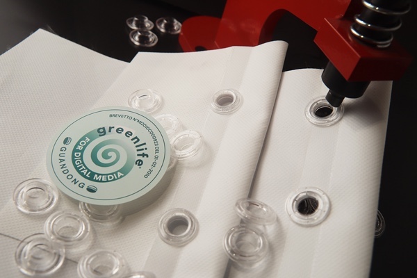 Additionally, Poly-banner guarantees excellent results for back-to-back pocket welding. For grommeting, Guandong recommends the use of polyolefin grommets to achieve a 100% recyclable outcome: the entire composition (media and grommets) is thus made from a single type of resin, PP-Polyolefin.